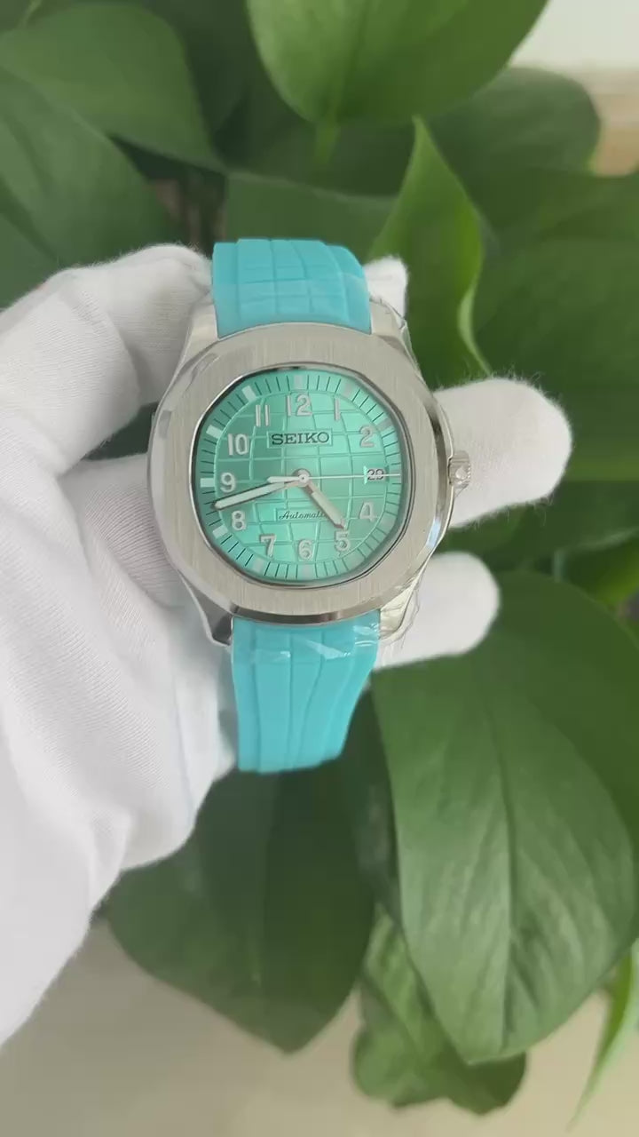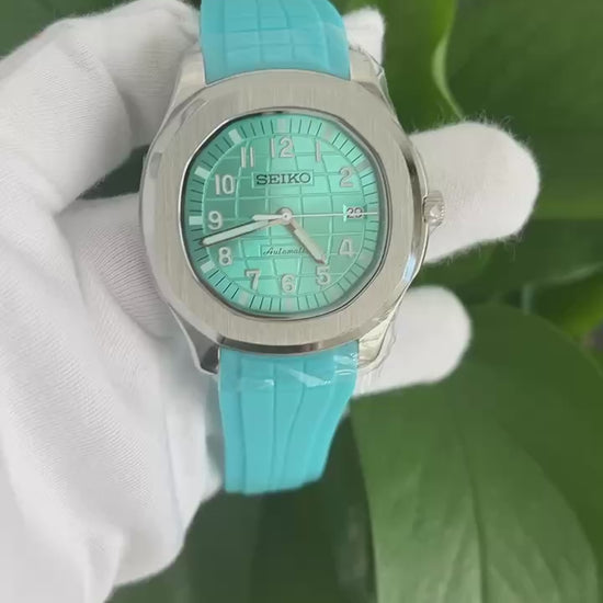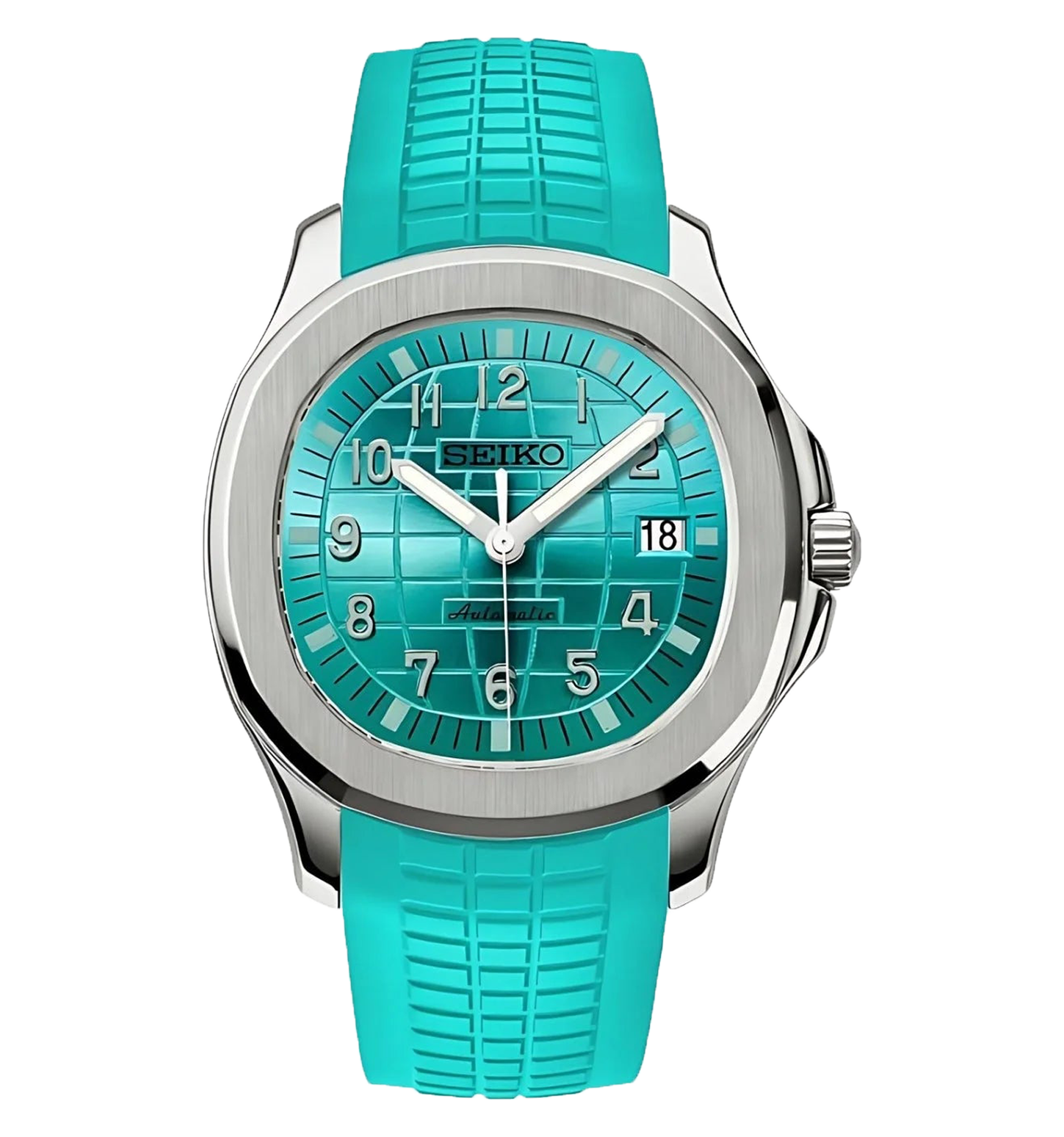 Make a refreshing statement with the Seiko Azure Surge a standout in the Iconic Series that fuses sleek design with vibrant individuality. The cool turquoise dial and matching silicone strap are framed by a refined silver Nautilus-style case, giving this piece a unique edge.