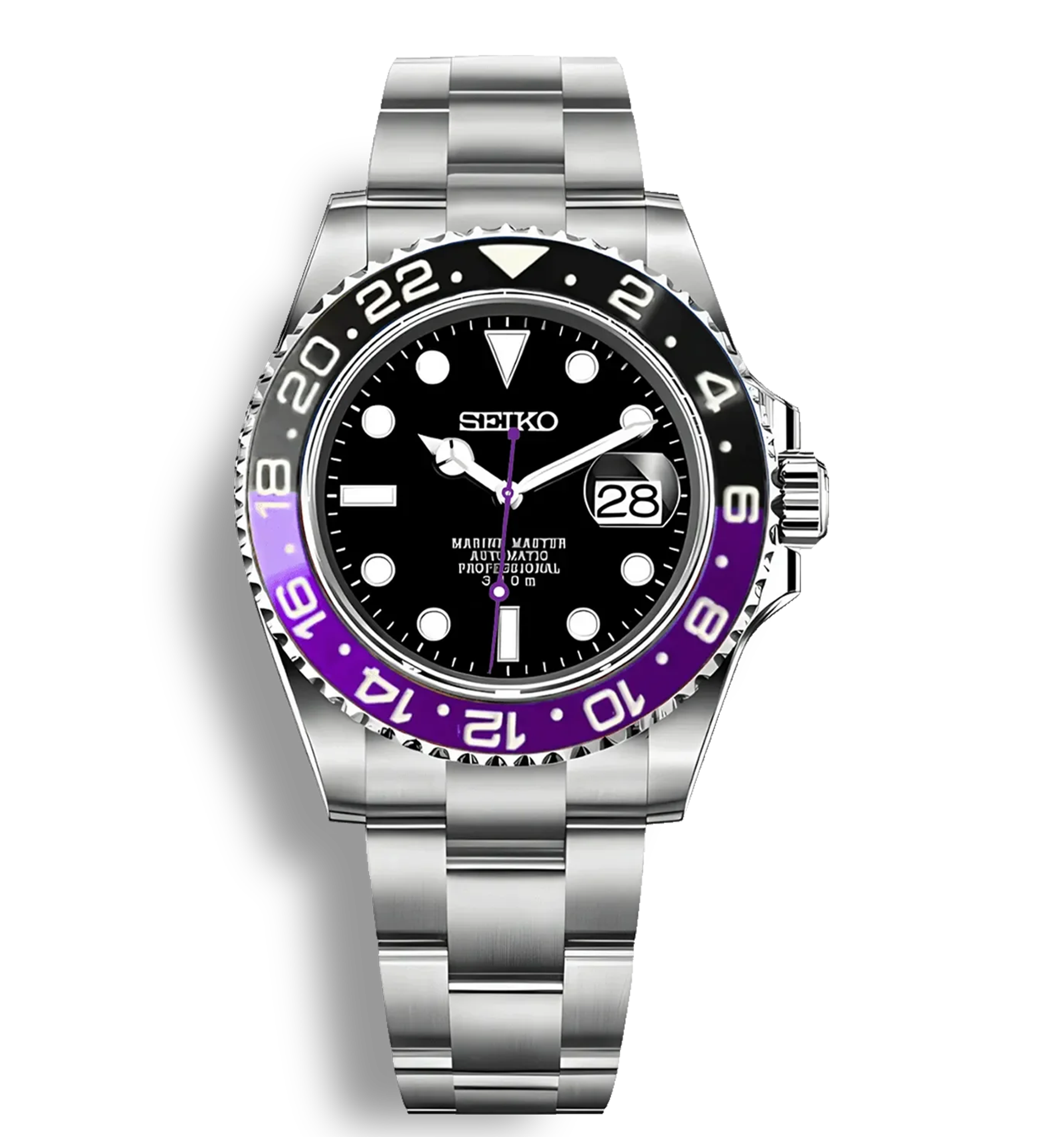 Introducing the Seiko Midnight Royale, a timepiece that exudes charisma and distinction. Its half black, half royal purple bezel creates a striking contrast that evokes depth and duality — perfect for those who walk the line between classic elegance and bold individuality.