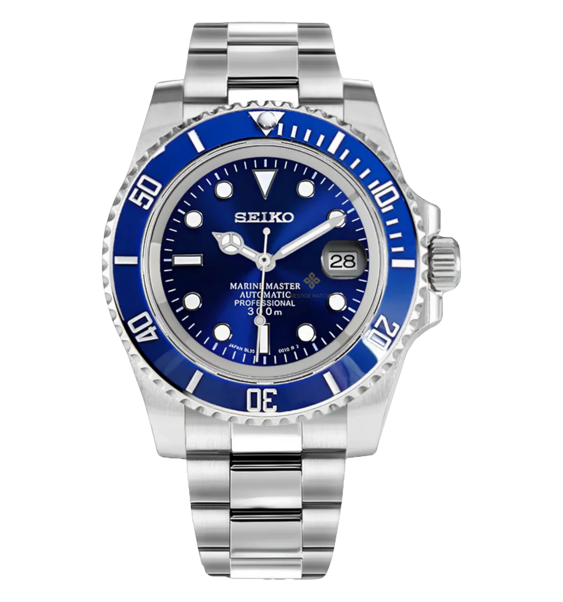 The Seiko Royal Deep pairs a bold rich blue bezel and face with a crisp white dial, creating a look that is both striking and timeless. Its silver stainless steel strap enhances the overall elegance, making it a perfect companion for day-to-night transitions.