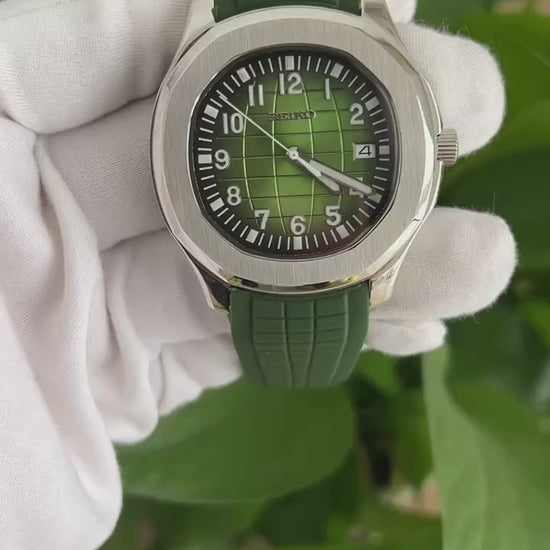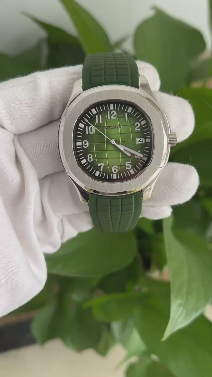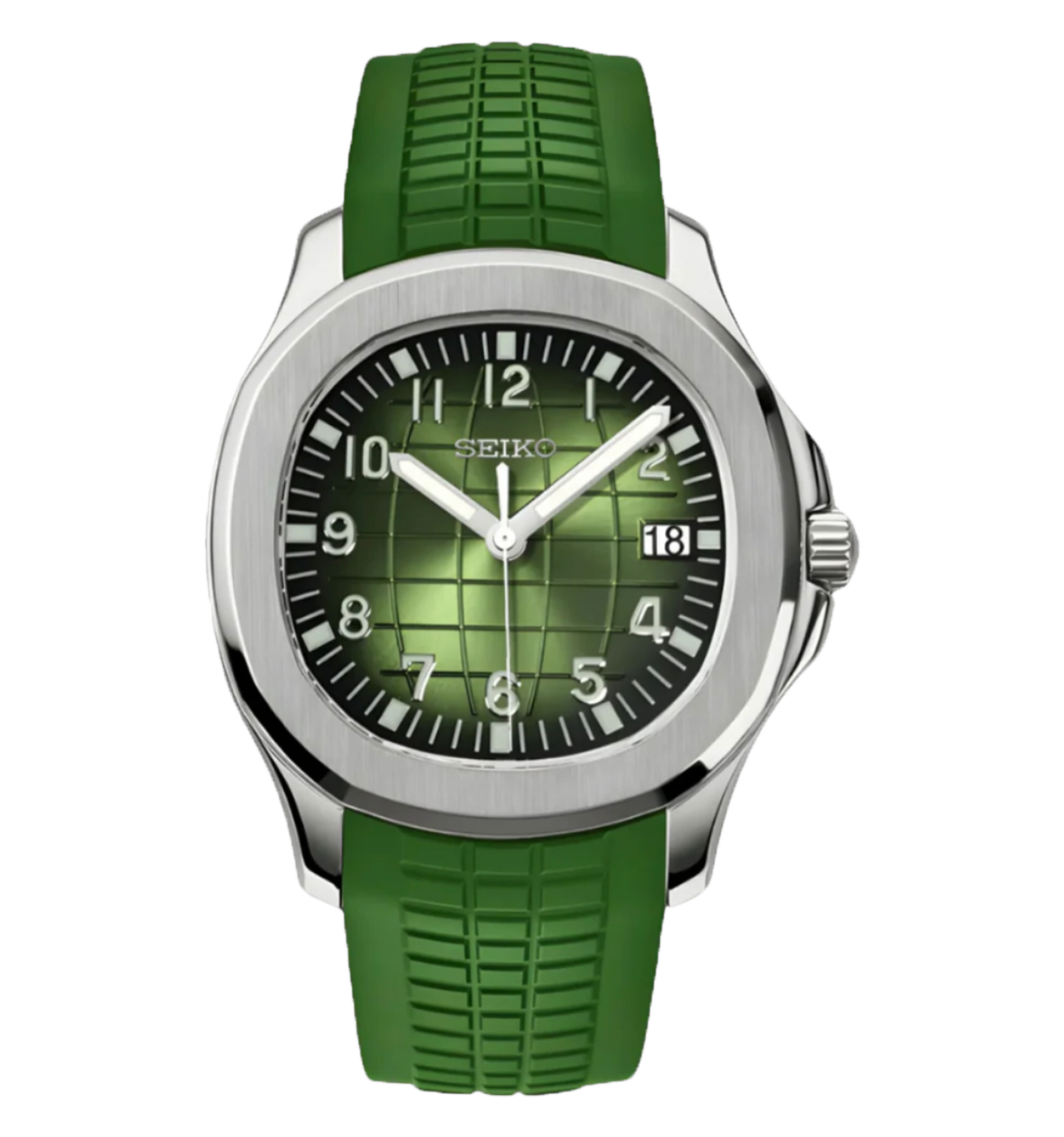 The Seiko Verdant Pulse channels fresh energy and effortless confidence with its bold grass-green silicone strap and matching dial. Housed in a Nautilus-style silver case, it strikes the perfect balance between trend and timelessness.